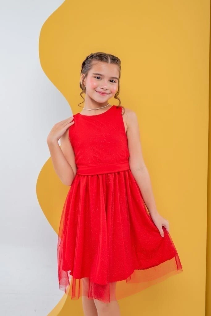 O destaque fica por conta do tule brilhoso, que adiciona um brilho sutil e sofisticado, tornando o vestido perfeito para festas e eventos memoráveis. O fechamento com botões nas costas facilita o vestir, enquanto o laço para amarração na cintura valoriza a silhueta com um toque delicado e feminino.